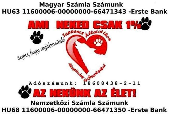 Hálásan köszönjük minden Állatbarátnak, Segítőnek és Szimpatizánsnak a támogatását, akik az adójuk 1 %-nak felajánlásával segítik az állatok mentését, a munkánkat. Azt a munkát, ami nem csupán egy-egy kutya megmentésében merül ki, de a végeláthatatlan orvosi költségeket, a menhelyen élő kutyusok gondozását, etetését, gazdásítását, valamint életkörülményeiknek megfelelő szinten tartását jelenti.